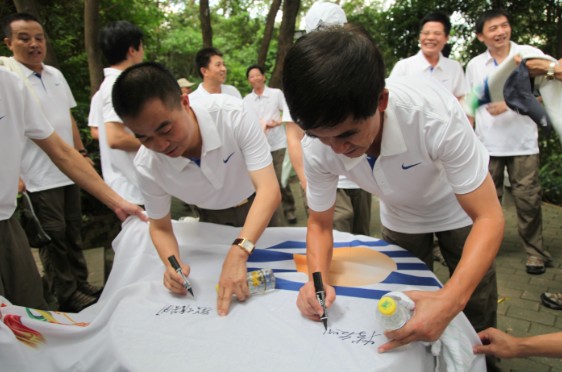 登山開始了,大家隨意分成一隊隊,沿著山路臺階拾級而上,穿行在青山綠樹間,吮吸著夾帶泥土味的新鮮空氣,邊輕松行走,邊交流工作心得,談笑間便來到了臨近山頂?shù)男蓓脚_。一面印有特發(fā)核心價值觀“全員職業(yè)化,成就美好生活”的司旗早已擺放好在石桌上,等候大家簽名祝福。劉愛群董事長率先提筆寫下“特發(fā)的明天更美好”的祝福語,深情表達特發(fā)人對美好未來的熱切期盼。陸續(xù)登上平臺的特發(fā)人紛紛留下自己對特發(fā)集團的美好心愿和祝福:“大展宏圖”、“正是特發(fā)三十年,創(chuàng)業(yè)當趁好時光”、“明天風(fēng)景更好”、“特發(fā)集團,一飛沖天”、“祝愿特發(fā),三十而立,輝煌再現(xiàn)”……共同祝愿特發(fā)集團在“全員職業(yè)化,成就美好生活”核心價值觀的引領(lǐng)下,在未來的發(fā)展道路上闊步前進,基業(yè)長青!
