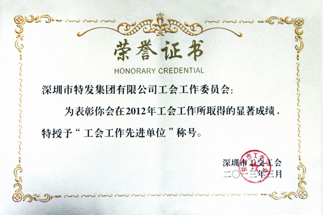 2013年3月,集團(tuán)工委會(huì)獲深圳市工交工會(huì)授予2012年度“工會(huì)工作先進(jìn)單位”稱號(hào)。同時(shí),系統(tǒng)企業(yè)特力集團(tuán)紀(jì)昌建、特發(fā)物業(yè)公司姜海忠獲市工交工會(huì)“優(yōu)秀工會(huì)工作者”稱號(hào);特發(fā)信息李彬?qū)W、特發(fā)地產(chǎn)唐大平獲得市工交工會(huì)“優(yōu)秀職工之友”稱號(hào);集團(tuán)總部岳紅瓊、特發(fā)黎明;蹖帿@市工交工會(huì)“優(yōu)秀工會(huì)積極分子”稱號(hào)。