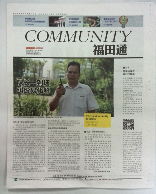 在2014年7月24日《南方都市報(bào)》出版發(fā)行的第92期深圳社區(qū)報(bào)《鵬城通》的“福田通”版中,刊出了“最強(qiáng)保安”的專題報(bào)道,特發(fā)物業(yè)公司特發(fā)小區(qū)管理處保安隊(duì)長——何紅斌正是這一期報(bào)道的主人公。