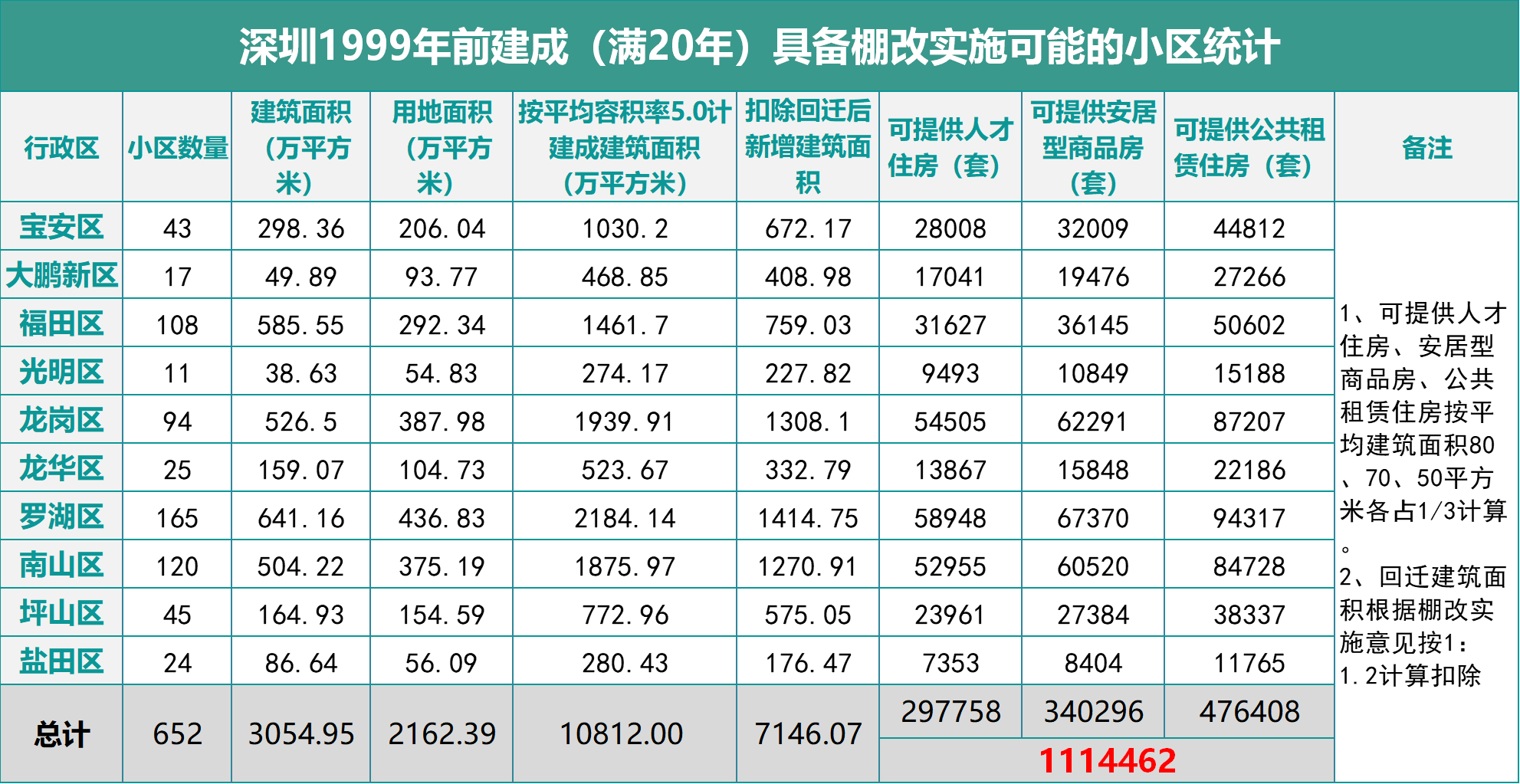 未來(lái)深圳通過(guò)棚改盤活的存量空間巨大。據(jù)不完全統(tǒng)計(jì),深圳1999年前建成且具備棚改實(shí)施條件的舊住宅小區(qū)約652個(gè),總占地面積2162萬(wàn)平方米,總建筑面積3054萬(wàn)平方米,如實(shí)施棚改(按平均容積率5.0計(jì)),扣除回遷建筑面積,可新增建筑面積7146萬(wàn)平方米,折合成保障房預(yù)計(jì)將新增供應(yīng)約111.4萬(wàn)套。隨著時(shí)間的推移,具備棚改實(shí)施條件的老舊住宅將持續(xù)增加,可供盤活的存量空間將持續(xù)增長(zhǎng),棚改或?qū)⒊蔀樯钲诔鞘猩?jí)的重要戰(zhàn)略和住房供應(yīng)渠道的有效補(bǔ)充。