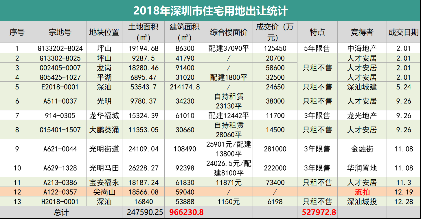 2018年深圳市土地累計(jì)供應(yīng)79宗,其中住宅用地供應(yīng)僅有13宗,成交12宗,流拍1宗。總成交建筑面積96.6萬(wàn)平方米,其中保障房配建面積52.8萬(wàn)平方米,占比約54.6%,按套均50平方米計(jì)算可新增保障房10559套。