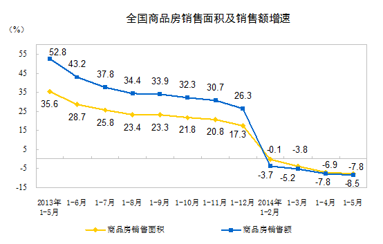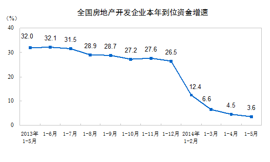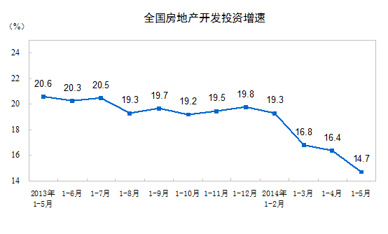 2014年1-5月份,全國(guó)房地產(chǎn)開發(fā)投資30739億元,同比名義增長(zhǎng)14.7%,增速比1-4月份回落1.7個(gè)百分點(diǎn)。其中,住宅投資21043億元,增長(zhǎng)14.6%,增速回落2個(gè)百分點(diǎn),占房地產(chǎn)開發(fā)投資的比重為68.5%。