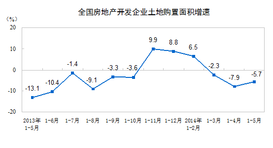 1-5月份,房地產(chǎn)開發(fā)企業(yè)土地購(gòu)置面積11090萬(wàn)平方米,同比下降5.7%,降幅比1-4月份收窄2.2個(gè)百分點(diǎn);土地成交價(jià)款2954億元,增長(zhǎng)8.7%,增速回落0.9個(gè)百分點(diǎn)。